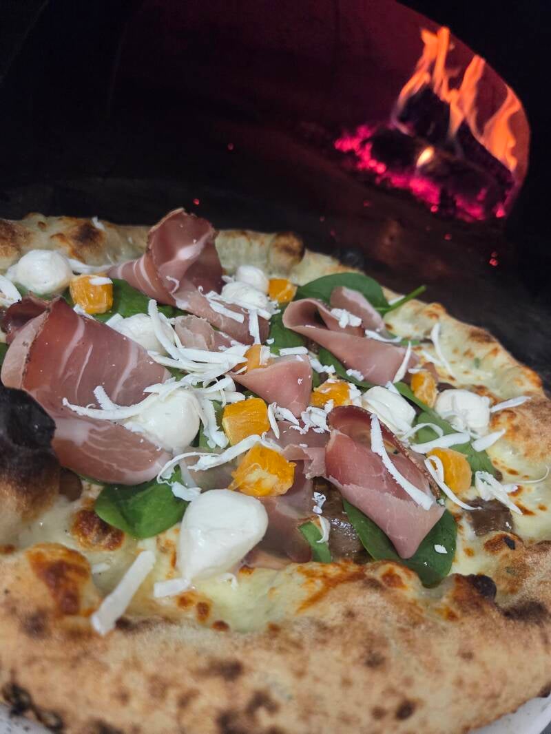 Base rouge, Roquette, jambon cru de parme, tomates cerise, mozzarella di bufala et copo de grana padano.